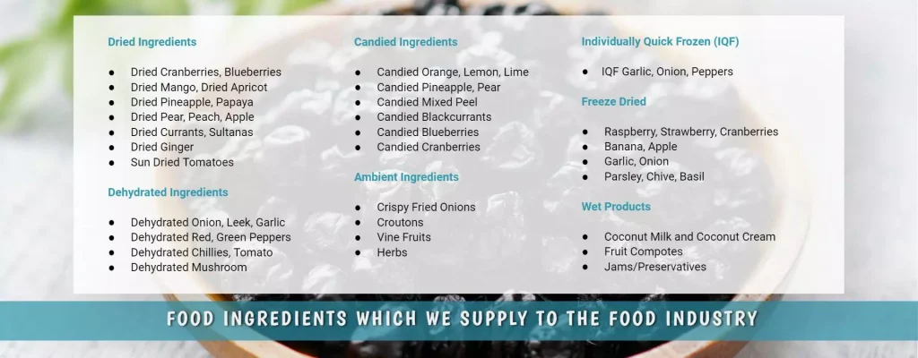 A trusted supplier of crispy fried onions, croutons, pasta, tomatoes, herbs, candied fruit, dried fruit and vegetables, dehydrated vegetables, Freeze Dried fruit and vegetables, IQF vegetables, vine fruits, coconut milk and paste, fruit compotes and jams/preservatives in the food industry..